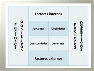 Este documento describe el análisis FODA como una herramienta estratégica para conocer la situación de una empresa mediante la evaluación de sus fortalezas, oportunidades, debilidades y amenazas. Explica que las fortalezas y debilidades dependen de factores internos, mientras que las oportunidades y amenazas dependen de factores externos. Además, proporciona preguntas guía para identificar cada uno de estos elementos y desarrollar una estrategia basada en ellos.