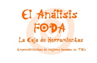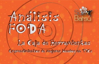 Este documento presenta una caja de herramientas para analizar emprendimientos de mujeres basados en TIC. La caja de herramientas incluye cinco instrumentos: el análisis FODA, las cadenas de valor de la empresa TIC, el análisis de sostenibilidad empresarial, el análisis empresarial y el análisis de contexto. Para cada instrumento, se provee una guía de aplicación, un ejemplo y recomendaciones. El documento luego profundiza en el análisis FODA, explicando cómo analiza