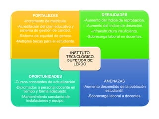 Este documento presenta un análisis FODA de la Universidad Interamericana para el Desarrollo Campus Gómez Palacio. Identifica sus fortalezas como el incremento de matrícula, acreditación del plan educativo y sistema de gestión de calidad, y sistema de equidad de género. Entre sus debilidades están el aumento del índice de reprobación y deserción, así como infraestructura insuficiente y sobrecarga laboral en docentes. Propone aprovechar oportunidades como cursos de actualización y mantenimiento de instalaciones para hacer