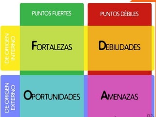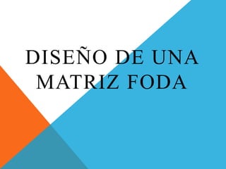 Este documento presenta una guía para diseñar una matriz FODA. Explica que el análisis FODA permite obtener un diagnóstico preciso de una entidad mediante la identificación de sus Fortalezas, Oportunidades, Debilidades y Amenazas. A continuación, define cada uno de estos elementos y ofrece un ejemplo de cómo aplicarlos a una organización mediante una tabla. Finalmente, propone como tarea elaborar una matriz FODA para la propia empresa del lector.