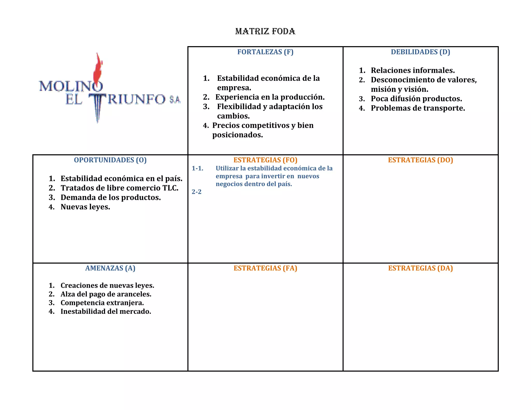 Este documento presenta una matriz FODA que analiza las fortalezas, debilidades, oportunidades y amenazas de una empresa. Entre las fortalezas se encuentran la estabilidad económica, experiencia en producción y flexibilidad ante cambios. Las debilidades incluyen relaciones informales, desconocimiento de valores y problemas de transporte. Dentro de las oportunidades se mencionan la estabilidad económica del país, tratados de libre comercio y demanda de productos. Por último, las amenazas son nuevas leyes, arance
