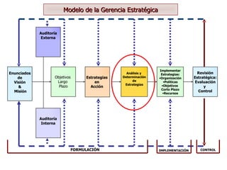 El documento describe el proceso de formulación e implementación de la estrategia de una empresa. Explica las etapas de la formulación estratégica que incluyen la evaluación interna y externa, el análisis FODA y la selección de estrategias. También presenta diferentes matrices para el análisis estratégico como la matriz FODA y BCG que ayudan a la empresa a definir su posición y estrategias a largo plazo.