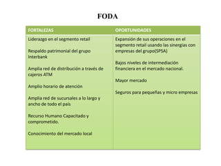 El documento presenta un análisis FODA de Interbank, destacando sus fortalezas como el liderazgo en el segmento retail y su amplia red de distribución, así como oportunidades como la expansión en el segmento retail y bajos niveles de intermediación financiera. También señala debilidades como niveles bajos de eficiencia operativa y amenazas como mayor competencia bancaria. Finalmente, propone estrategias como aprovechar las fortalezas para expandirse y aumentar presencia territorial para hacer frente a amenazas.