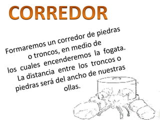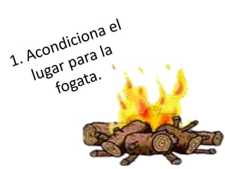 Este documento describe diferentes tipos de fogatas y cómo hacerlas. Para hacer una fogata básica se necesitan tres elementos: oxígeno, calor y combustible. Se proporcionan instrucciones para hacer una fogata para calentar una carpa, una fogata contra el viento, una fogata sin humo y una fogata para calentarse o cocinar.
