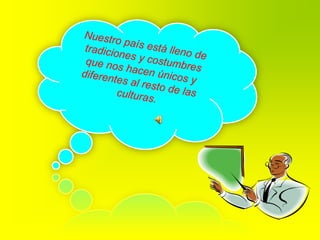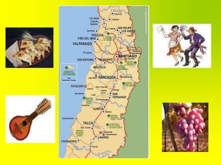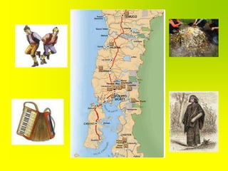 El folclor chileno se origina de la fusión de las tradiciones indígenas, españolas y chilenas a partir del siglo XVIII, formando una herencia cultural única que incluye música, bailes, trajes y comidas transmitidos de generación en generación. El folclor se refiere a toda la cultura de un pueblo y varía según la zona del país.