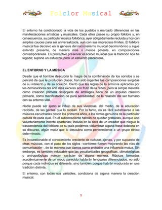Este documento trata sobre el folclor musical en Colombia. Explica que el folclor musical es un legado que se transmite oralmente sin notación escrita y que se aprende de oído. Explora los orígenes del folclor colombiano en las culturas indígena, española y africana, y cómo estas se fusionaron en diferentes regiones del país. También describe elementos de la música folclórica colombiana como sus raíces anónimas y cómo se transmite a través de tradiciones orales en fiestas y eventos populares.