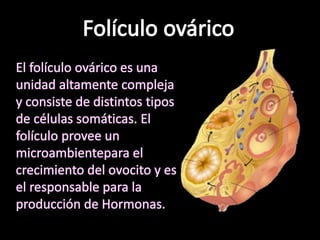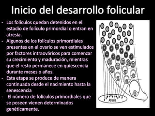 Este documento describe las características de los diferentes tipos de folículos durante el desarrollo ovárico. Comienza con los folículos primarios que aparecen al día 140 de gestación y miden aproximadamente 30 μm, luego continúa con los folículos secundarios que aparecen al día 210 con dos capas de células y ovocitos de 50-60 μm, y finaliza con los folículos terciarios que tienen una cavidad llena de líquido llamada antro y aparecen después de los 230 días de gestación.