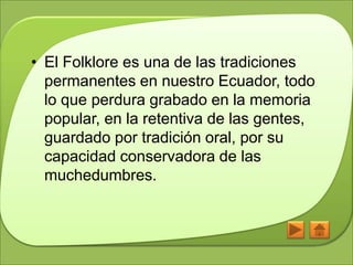Este documento clasifica y describe varios tipos de folklore, incluyendo folklore general, factual, narrativo, espiritual, interdisciplinario, mágico, social, literario y poético. Explica que el folklore incluye tradiciones orales, creencias, música, fiestas regionales y más. Además, destaca que el folklore es importante para conocer y valorar las culturas y costumbres de un pueblo.