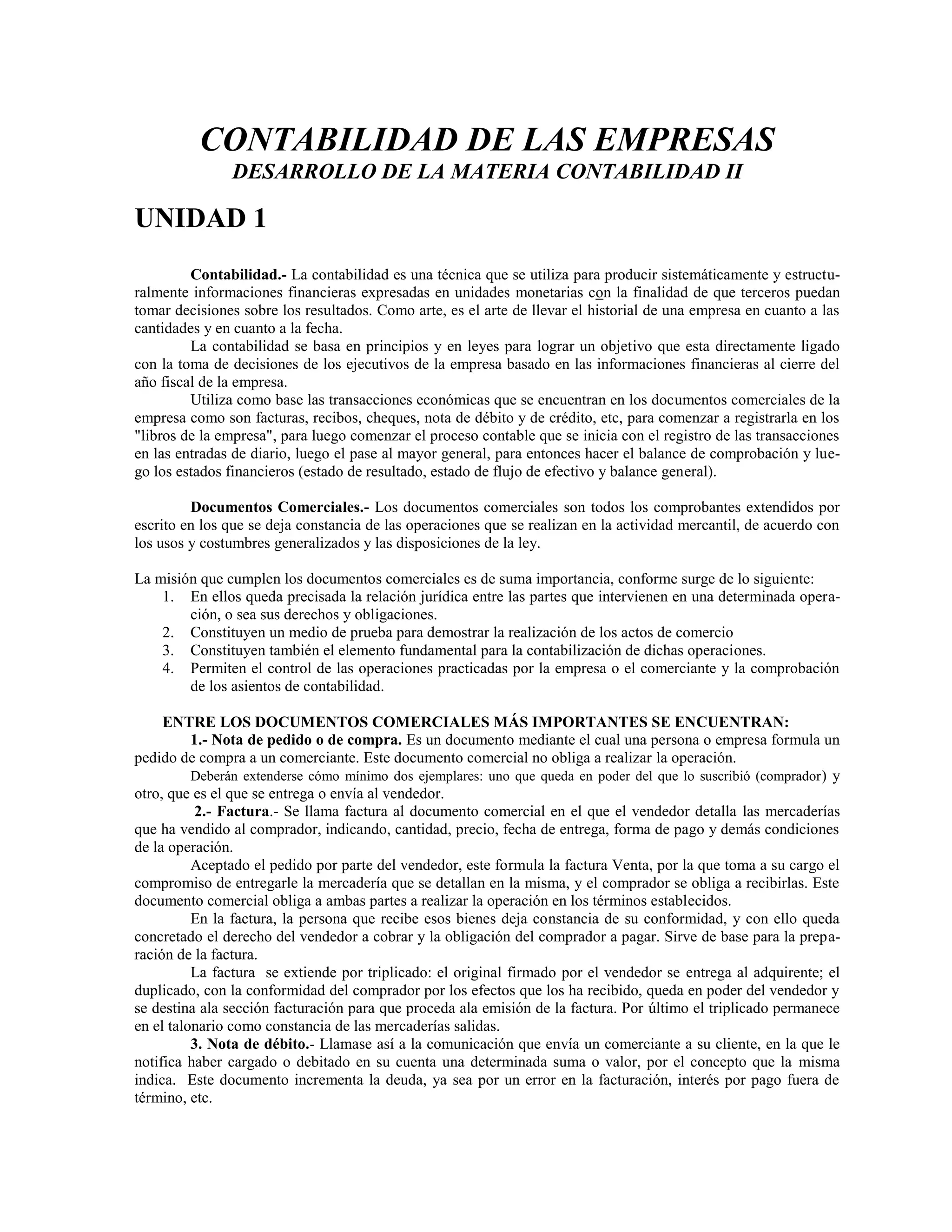 El documento habla sobre la contabilidad de las empresas y describe varios conceptos fundamentales como los documentos comerciales (facturas, cheques, notas de débito/crédito), los libros de contabilidad (diario general, mayor general), y las técnicas contables como los diarios de columnas especiales y los mayores auxiliares para cuentas por cobrar y pagar. También explica los documentos fuente como facturas y cheques que sirven como base para los registros contables.