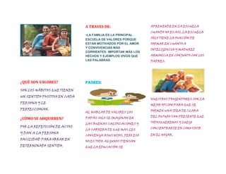 La mejor manera de enseñar valores a los hijos es a través del ejemplo de los padres. La familia es la principal escuela de valores porque los valores se transmiten a través de las interacciones diarias y los hechos más que las palabras. Los padres deben fomentar valores positivos en los hijos desde una edad temprana a través de retos razonables y apoyo para que los niños desarrollen la responsabilidad y conciencia de sus acciones.