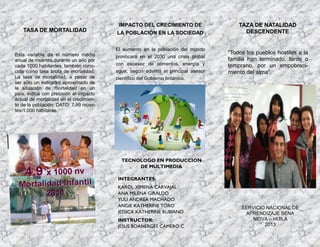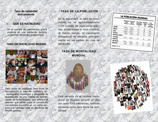 El documento discute el impacto del crecimiento de la población mundial y las tasas de natalidad y mortalidad. Advierte que el aumento continuo de la población mundial provocará una crisis global para 2030 debido a la escasez de alimentos, energía y agua. Actualmente, la tasa de crecimiento poblacional es de aproximadamente 1.2% anual a pesar de las grandes disparidades entre países, y el crecimiento ocurre principalmente en naciones en desarrollo.