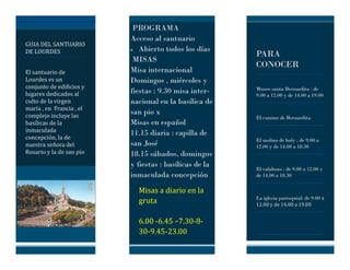 El documento proporciona información sobre los servicios y lugares de interés en el Santuario de Lourdes en Francia. Incluye detalles sobre horarios de misas diarias en varias basílicas y capillas en diferentes idiomas, así como información sobre lugares como la Gruta, el Viacrucis, la Capilla de Adoración, museos y lugares históricos. También enumera algunos hoteles populares cercanos y restaurantes para visitar.