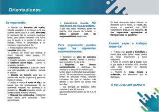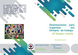 Este documento ofrece orientaciones para organizar el tiempo de trabajo desde casa durante la cuarentena, incluyendo establecer horarios de sueño y comidas, limitar el tiempo en dispositivos, hacer ejercicio, diseñar un horario semanal de tareas escolares de al menos 5 horas diarias, tomar descansos cortos entre asignaciones, y mantener una mesa de estudio ordenada y enfocada. El objetivo es ayudar a los estudiantes a mantener hábitos de trabajo y no considerar este tiempo como vacaciones.