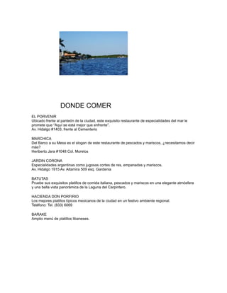 Tampico es el puerto más importante del noreste de México, ubicado en la costa este del estado de Tamaulipas. Ofrece varias opciones para hospedarse, comer, realizar actividades recreativas como pesca deportiva en la laguna o playa, y vida nocturna con bares y discotecas.