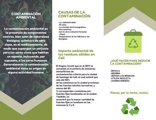 El documento habla sobre la contaminación ambiental causada por el mal manejo de basuras y residuos sólidos en la ciudad de Santiago de Cali, Colombia. Más del 80% de las emisiones en la ciudad provienen de fuentes móviles como vehículos, y menos del 20% de fuentes fijas localizadas en algunas comunas. La contaminación ambiental perjudica a los seres vivos y generalmente tiene su origen en actividades humanas como el mal manejo de residuos.