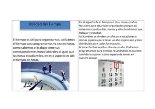 El tiempo es útil para organizar nuestras vidas, ya sea en horas para programar el trabajo y los estudios, o en días, meses y años para estar bien organizados con las fechas de trabajo, estudios y vacaciones. Al conocer las fechas exactas, podemos programar eventos y tareas en nuestros calendarios y celulares.