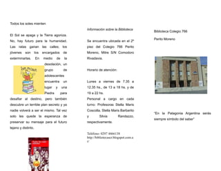 El documento habla sobre la creación de un Club de Lectura para padres en una escuela. El Club de Lectura es un grupo que se reúne una vez al mes para comentar y discutir libros que los miembros han leído previamente en un ambiente relajado. El documento invita a los padres a unirse al club ya que la lectura permite explorar nuevas ideas y perspectivas.
