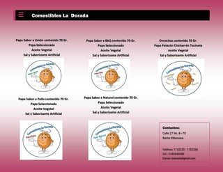 Comestibles La Dorada es una empresa ubicada en Ipiales, Colombia fundada en 2015 por graduados del Sena para vender papas fritas. Ofrece papas fritas en diferentes sabores como limón, pollo y BBQ de forma individual y familiar, y está registrada legalmente como pequeño contribuyente.