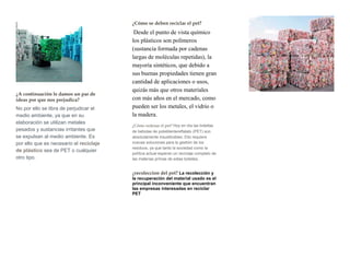 El documento habla sobre cómo empezar un negocio de reciclaje de plástico, específicamente de PET. Explica que se pueden recopilar y vender plásticos a otras empresas o comprar equipos para procesarlos uno mismo. También menciona que el reciclaje de PET se está convirtiendo en una gran oportunidad de negocio pero todavía enfrenta desafíos.