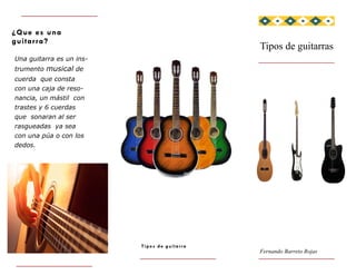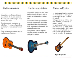 Este documento describe tres tipos principales de guitarras: la guitarra española o clásica, que tiene cuerdas de nylon y un sonido suave; la guitarra acústica, que se parece a la clásica pero tiene cuerdas de metal y un sonido más agudo; y la guitarra eléctrica, que usa cuerdas de metal y se amplifica a través de un amplificador, permitiendo distorsionar su sonido.