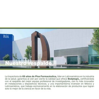 Bodylogic ofrece productos naturales de alta calidad en diversas líneas como nutrición y aromaterapia, respaldados por Pisa Farmacéutica con más de 69 años de experiencia. La empresa promueve oportunidades de negocio para mejorar el bienestar familiar, enfatizando valores como respeto y honestidad. Además, se destacan productos específicos para el cuidado de la salud, como suplementos y disminución de peso, todos formulados para apoyar la salud y la calidad de vida de los consumidores.