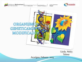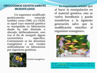 Este documento describe los organismos genéticamente modificados (OGM), incluyendo que son organismos cuyo material genético ha sido manipulado para otorgarles características específicas. Explica que las principales empresas que fabrican OGM son Monsanto, Syngenta, Dupont y Bayer, y que los OGM incluyen bacterias, animales y plantas transgénicas. También discute algunas ventajas y desventajas potenciales de los OGM.