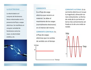 Este documento describe los diferentes tipos de circuitos eléctricos, incluyendo circuitos en serie, paralelo y mixtos. También define electricidad, corriente eléctrica, corriente continua y corriente alterna. La electricidad se produce por el flujo de cargas eléctricas a través de un material, y un circuito eléctrico es un recorrido cerrado que transporta la energía eléctrica de los elementos productores a los elementos consumidores.