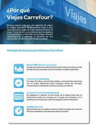 Este folleto ofrece viajes a Egipto, Jordania e Israel a través de la agencia Viajes Carrefour. Proporciona información sobre hoteles y barcos en Egipto, con opciones desde 4 hasta 5 estrellas lujo superior en Ciudad del Cairo, Asuán y Sharm El Sheikh. También ofrece ventajas para socios del Club Carrefour como descuentos y excursiones exclusivas.