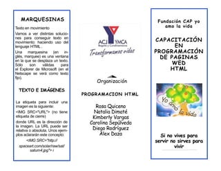Este documento proporciona información sobre varios temas relacionados con HTML, incluyendo marquesinas, imágenes, decoración de texto, caracteres especiales y enlaces. Explica cómo crear texto en movimiento con marquesinas en HTML, cómo insertar imágenes con la etiqueta <IMG> y sus atributos SRC, y diferentes valores para la propiedad text-decoration como none, underline y linethrough. También cubre el uso de entidades para caracteres especiales y la creación de enlaces.