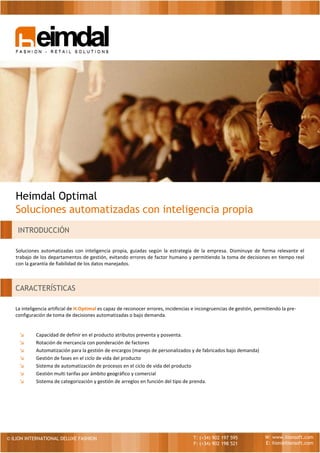 Heimdal Optimal es una solución automatizada con inteligencia artificial que reduce el trabajo de los departamentos de gestión al reconocer errores e incidencias y permitir la toma de decisiones automatizada en tiempo real con datos fiables. Ofrece características como la definición de atributos de productos, rotación de mercancía, gestión de pedidos y ciclo de vida de productos, además de un sistema de comisiones y primas para incentivar las ventas.