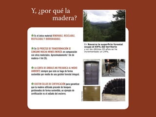 El documento describe cómo la madera de fuentes sostenibles se utiliza en los Sanfermines de varias maneras que ayudan al medio ambiente, como el vallado del encierro que almacena 180 toneladas de CO2 y el uso de madera en la procesión que absorbe media tonelada de CO2. También explica que la madera es renovable, reciclable y consume menos energía que otros materiales en su proceso de transformación.