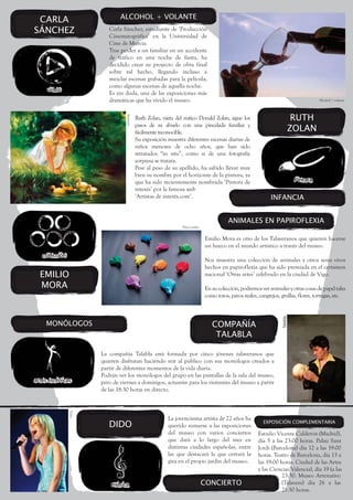 Este documento presenta las nuevas exposiciones y eventos que tendrán lugar en el Museo Artenativo de Talavera de la Reina durante el mes. Se expondrán obras de pintura, escultura de papiroflexia y fotografía de varios artistas locales como Ruth Zolan, Emilio Mora, Carla Sánchez y la Compañía Talabla, además de varios conciertos de la cantante Dido. El museo también albergará la actuación en directo de la Compañía Talabla los fines de semana.