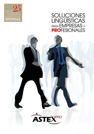 Astex ofrece servicios de formación en idiomas para empresas y profesionales, con más de 25 años de experiencia y una amplia gama de programas, incluyendo formación presencial, online y en el extranjero. Cuenta con un equipo de más de 350 formadores nativos y una metodología innovadora, adaptando cada programa a las necesidades específicas de sus clientes. Además, proporciona servicios de traducción y certificación, así como gestión de ayudas a la formación.