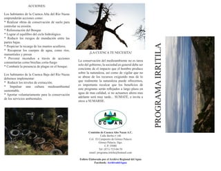 El documento describe los problemas de la sobreexplotación del agua en la Cuenca Alta del Río Nazas en Durango, México, incluyendo la deforestación, la erosión del suelo y la contaminación del agua. Propone un programa llamado Irritila que paga a las comunidades locales por servicios ambientales como la reforestación y la conservación del suelo para mejorar el abastecimiento de agua a largo plazo para la región Lagunera.