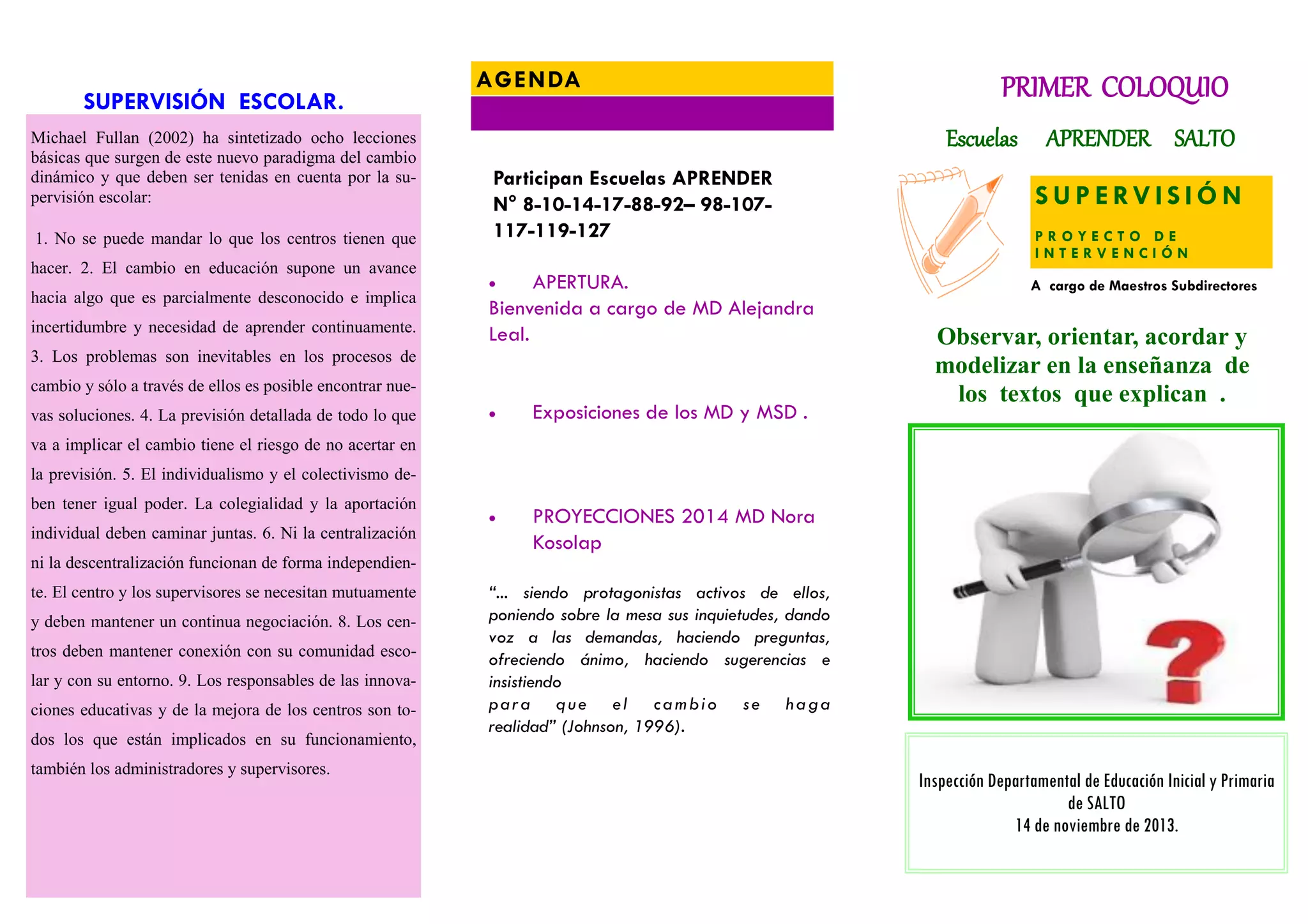 El documento resume ocho lecciones clave sobre el cambio dinámico en la supervisión escolar según Michael Fullan (2002), incluyendo que (1) el cambio educativo implica avanzar hacia lo desconocido con incertidumbre y aprendizaje continuo, (2) los problemas son inevitables pero conducen a nuevas soluciones, y (3) tanto la centralización como la descentralización son necesarias y deben negociarse mutuamente entre los centros y supervisores.
