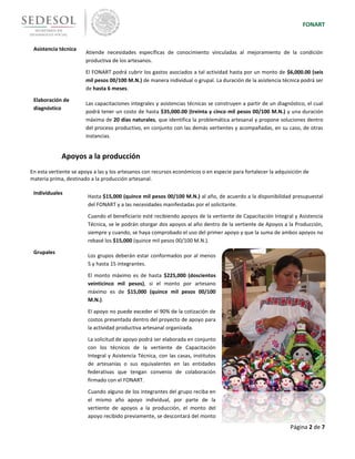 El documento describe el Programa FONART, el cual apoya a artesanos mexicanos a mejorar la elaboración y venta de sus artesanías para mejorar sus ingresos y condiciones de vida. El programa ofrece capacitación, asistencia técnica, apoyos a la producción y comercialización, concursos de arte popular y salud ocupacional. Los beneficiarios deben ser artesanos mexicanos con ingresos bajos y presentar documentación requerida.