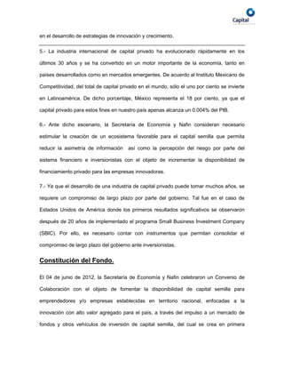El documento establece las pautas para el Fondo de Coinversión de Capital Semilla. El fondo proporcionará financiamiento a empresas innovadoras en etapas tempranas a través de dos modalidades: invirtiendo en vehículos de capital semilla existentes o realizando inversiones directas en proyectos individuales. El fondo busca reducir la brecha de financiamiento para startups en México y fomentar un ecosistema de capital semilla a largo plazo.