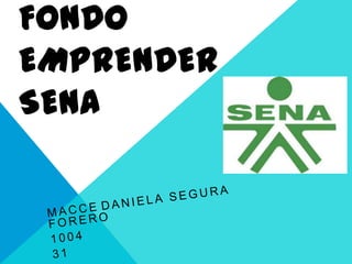 El Fondo Emprender SENA es un fondo creado por el gobierno para financiar iniciativas empresariales de alumnos y egresados del SENA. Se rige por el derecho privado y su presupuesto proviene en un 80% de la cuota de aprendizaje. Tiene como objetivo apoyar proyectos productivos que integren los conocimientos de los emprendedores con el desarrollo de nuevas empresas a través de etapas de formulación, evaluación, asignación de recursos y ejecución.