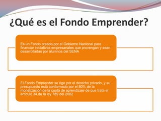El Fondo Emprender es un fondo creado por el gobierno colombiano para financiar iniciativas empresariales de estudiantes del SENA. Tiene como objetivo apoyar proyectos productivos que combinen los conocimientos adquiridos por los emprendedores con el desarrollo de nuevas empresas, facilitando el acceso a capital inicial. El proceso incluye la evaluación del plan de negocios, la asignación de recursos, la formulación del plan, su ejecución, y el seguimiento y evaluación de resultados.