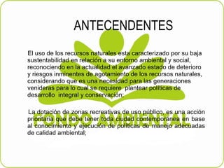 La resolución 232-SCM-2005 establece la Unidad Ejecutora Fondo Ambiental del Municipio de Riobamba para incentivar el desarrollo sustentable y financiar proyectos de protección ambiental. El fondo busca gestionar recursos a través de donaciones del 25% del impuesto a la renta, créditos, y optimizar la inversión en el Parque Lineal Chibunga incorporando participación ciudadana.