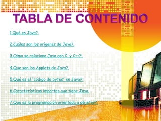 El documento presenta una introducción a los fundamentos de Java. Explica que Java es un lenguaje de programación orientado a objetos diseñado para ser seguro, portable y robusto. Detalla el origen de Java, su relación con C y C++, y características clave como applets de Java, código de bytes, programación orientada a objetos, tipos de datos, estructuras de control, JDK y NetBeans.
