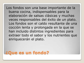 Un fondo es una base importante en la cocina elaborada mediante la cocción prolongada de ingredientes como carne, huesos, verduras y hierbas para extraer sabor. Existen fondos claros y oscuros. Un fondo claro se hace con pollo, verduras y vino blanco para salsas claras, mientras que un fondo oscuro requiere huesos asados y vino tinto para dar color y sabor intensos. La sopa de cebolla se prepara cociendo cebollas en mantequilla y harina con caldo vegetal y un toque de