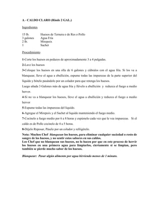 El documento proporciona instrucciones para preparar diferentes tipos de caldos y salsas, incluyendo caldo claro, caldo oscuro, caldo de vegetales, técnicas para espesar salsas como el roux, y salsas madres como la bechamel y sus derivadas. Explica los ingredientes, procedimientos y notas clave para cada receta.