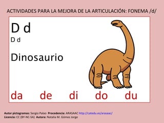 Este documento presenta una actividad para mejorar la articulación del fonema /d/ utilizando pictogramas creados por Sergio Palao y alojados en el sitio ARASAAC bajo licencia Creative Commons. El documento explica que los pictogramas no pueden ser editados o publicados con fines comerciales sin permiso y proporciona instrucciones para realizar ejercicios de segmentación fonémica y silábica con las imágenes provistas.