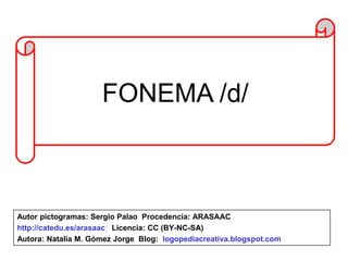 Este documento presenta una lista de palabras que comienzan con el fonema /d/ en español, incluyendo dibujo, dormir, delgada, dedo, diente, dinero, ducha, deporte, día y más. La lista contiene más de 50 palabras diferentes para ayudar a practicar el sonido de la letra d.