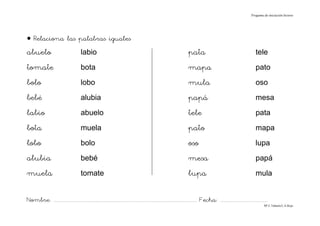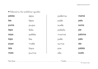 Este documento presenta un programa de iniciación a la lectura que incluye actividades como relacionar palabras iguales, escribir palabras que comienzan con una letra determinada, ordenar letras para formar palabras, y encontrar el nombre de dibujos a partir de sus letras desordenadas. El programa contiene múltiples ejercicios para trabajar reconocimiento de letras, sílabas y palabras completas.