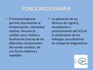 El fonocardiograma permite documentar objetivamente los sonidos cardiacos y detectar patologías como disfunción diastólica, problemas en las válvulas cardiacas, cardiomiopatías y más. Tradicionalmente los médicos usan la auscultación para identificar los ruidos cardiacos, pero el fonocardiograma proporciona una evaluación más precisa al registrar la temporización, intensidad y otras características de los sonidos de manera repetible.