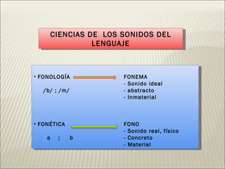 El documento resume los conceptos fundamentales de fonología y fonética. La fonología estudia los fonemas, que son unidades abstractas e indivisibles que diferencian significados. La fonética estudia los fonos, que son las realizaciones físicas concretas de los sonidos. El documento también describe los órganos fonadores y cómo se producen y clasifican los sonidos del habla.