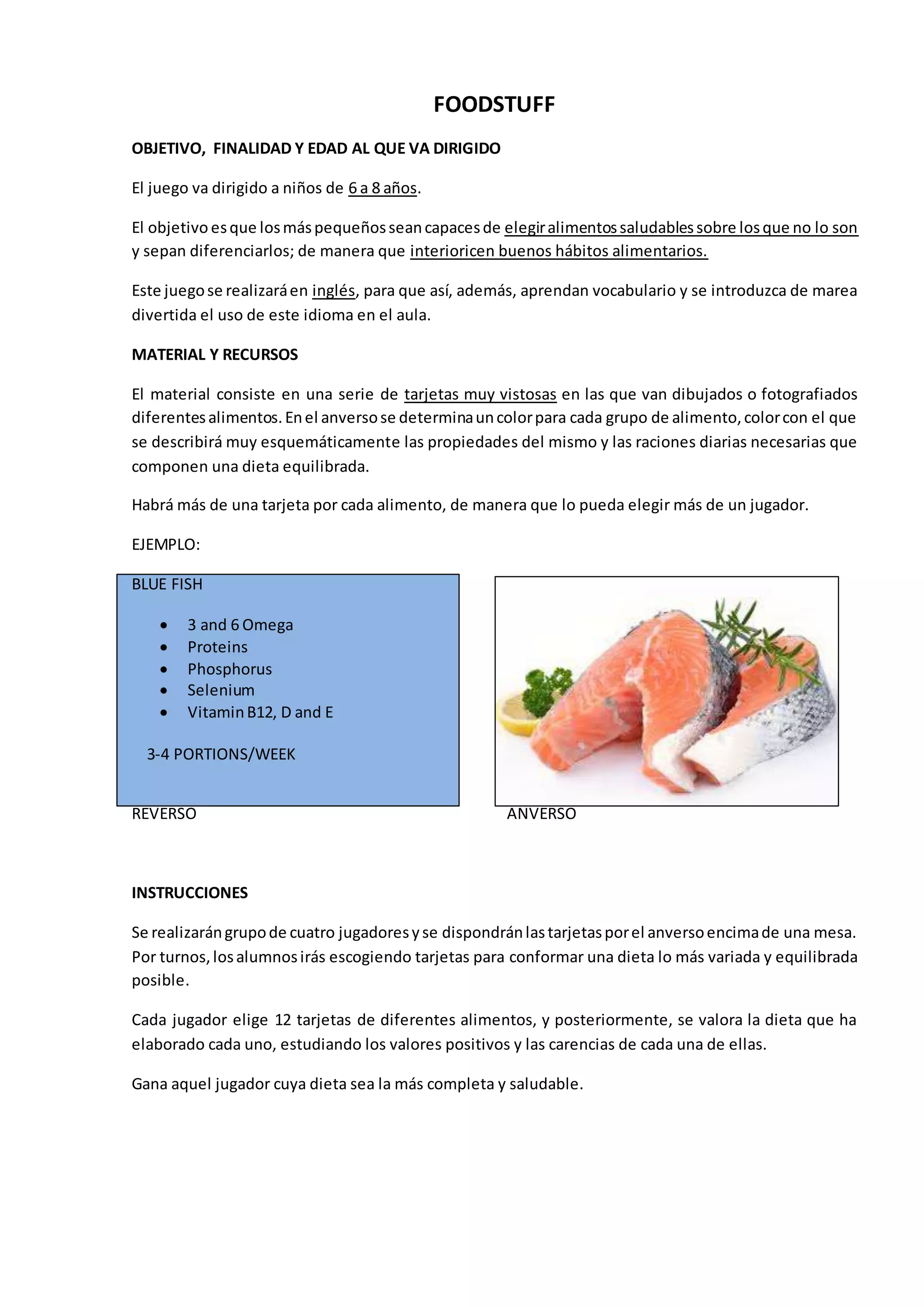 Este juego busca enseñar a niños de 6 a 8 años a elegir alimentos saludables a través de tarjetas con dibujos de diferentes alimentos. Los niños aprenderán sobre los nutrientes y porciones recomendadas de cada alimento. Jugarán en grupos para elegir tarjetas y conformar dietas equilibradas, ganando el jugador con la dieta más completa. El juego se hará en inglés para que también aprendan vocabulario.