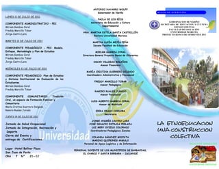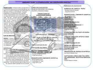 Este documento presenta el programa de un seminario taller sobre etnoeducación que se llevará a cabo del 4 al 8 de julio de 2011 en el Hotel Bolívar Plaza en San Juan de Pasto. El objetivo del seminario es orientar la construcción de un Proyecto Etnoeducativo Comunitario para tres municipios a partir de la resignificación de sus componentes conceptual, administrativo, pedagógico y comunitario. A lo largo de la semana se abordarán temas como el proyecto etnoeducativo comunitario, el currículo propio, escenarios de
